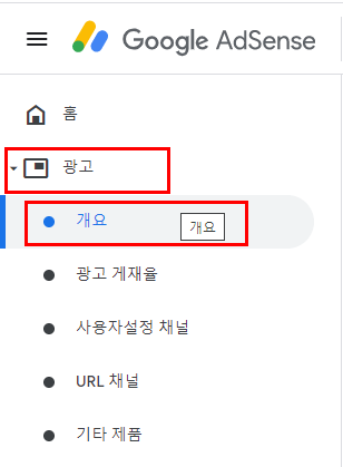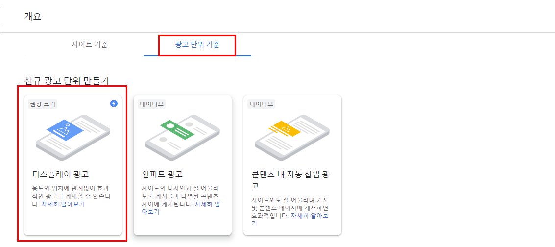 구글 애드센스에 로그인한 후 광고 → 개요 → 광고단위기준 → 디스플레이 광고를 눌러줍니다.