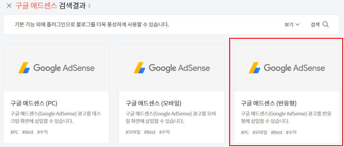 티스토리 나의 블로그 관리 → 플러그인 → 검색 → '구글애드센스'