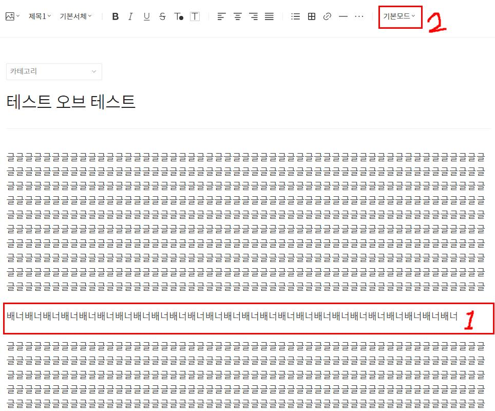 2. 이미지에서 2번 '기본모드'를 'HTML' 로 변경해주세요