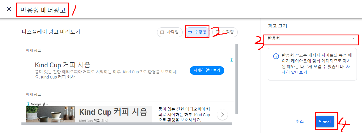 → 수평형과 반응형 선택 → 만들기 클릭