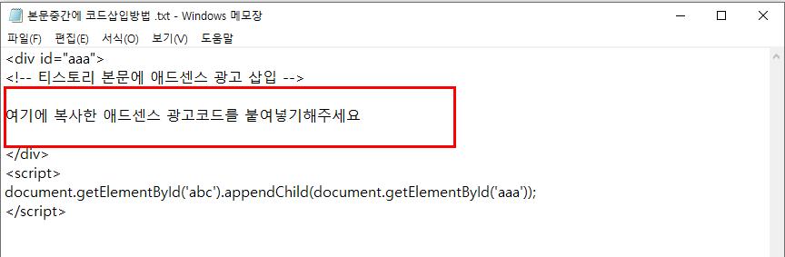 2. 복사한 애드센스 코드를 메모장 내용중 빨간색 칸 안에 붙여넣기(Ctrl + V) 해주세요
