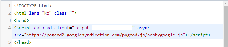 <head> 부분 밑에 좀전에 복사한 구글애드센스 사이트연결 코드를 붙여넣기(Ctrl + v) 해주세요
