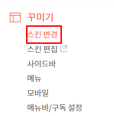 2. 새창에 자신의 티스토리 블로그관리에 접속후 스킨변경을 눌러주세요