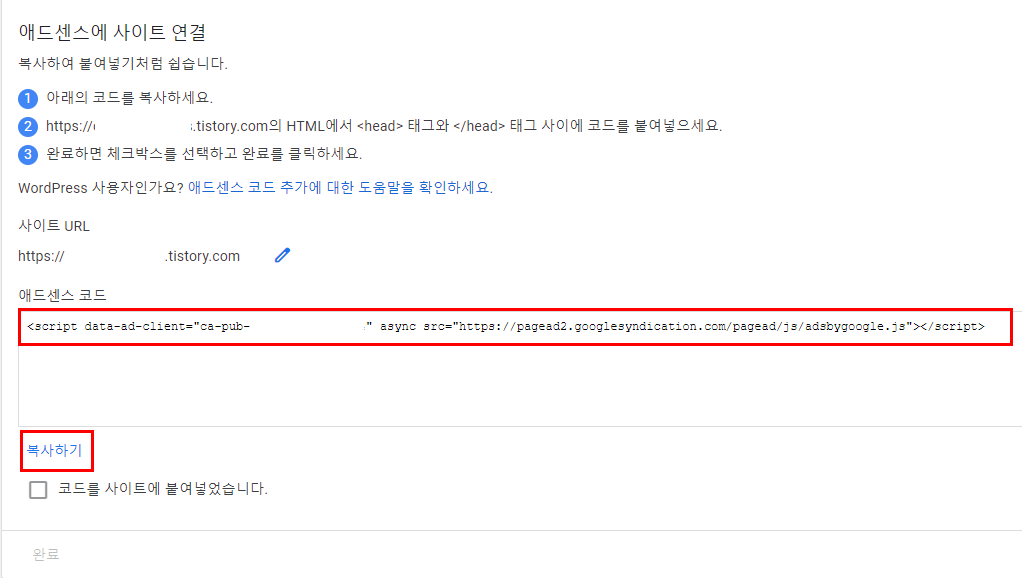6. 다시 구글애드센스 가입하던 창으로 돌아와 체크후 완료를 눌러주세요
